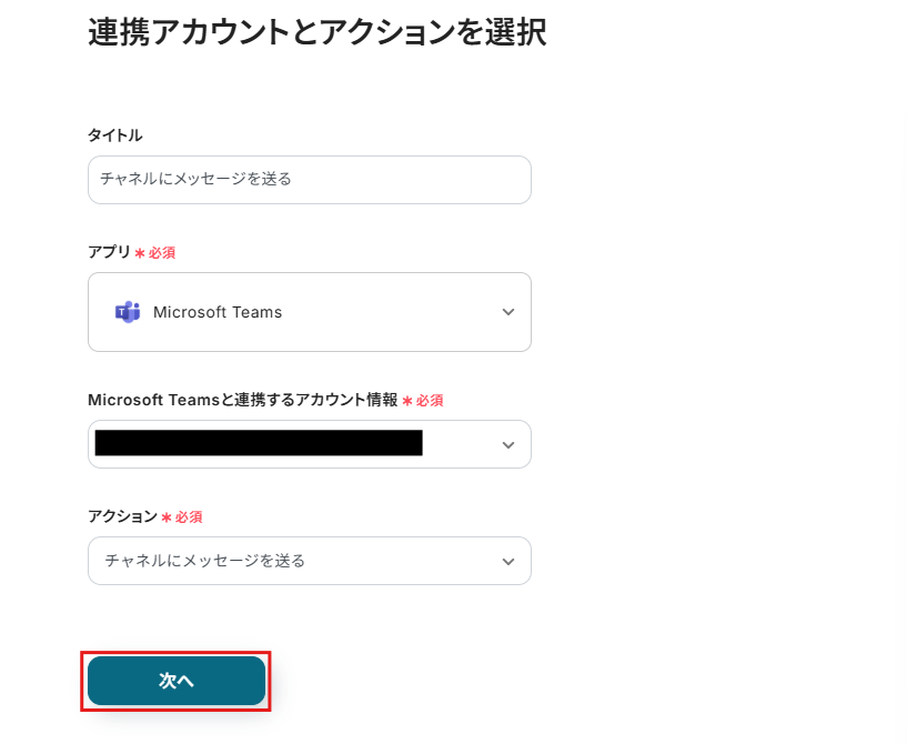 Microsoft Teamsに通知するチャンネルと本文を設定していきます。