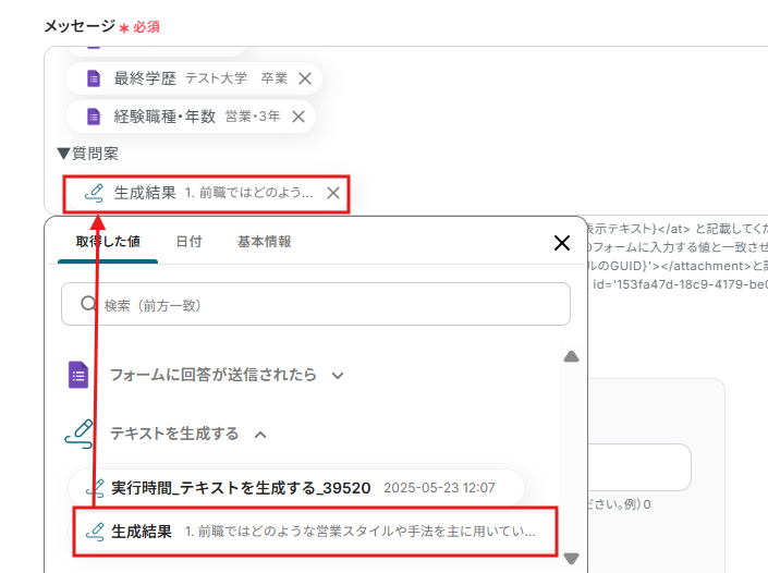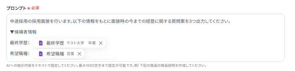 「Googleフォームで中途採用の候補者情報が送信されたら、AIで面接の質問案を生成してMicrosoft Teamsに通知する」ワークフローは、候補者情報をもとにAIが質問案を作成します。