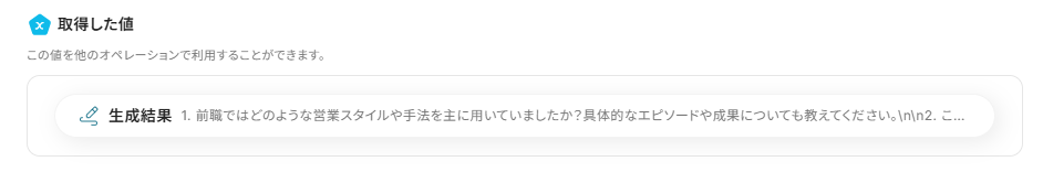 「Googleフォームで採用候補者の情報が送信されたら、AIで面接の質問案を生成してSlackに通知する」フローを利用すると、入力された候補者情報から面接用の質問案を自動で作成できます。