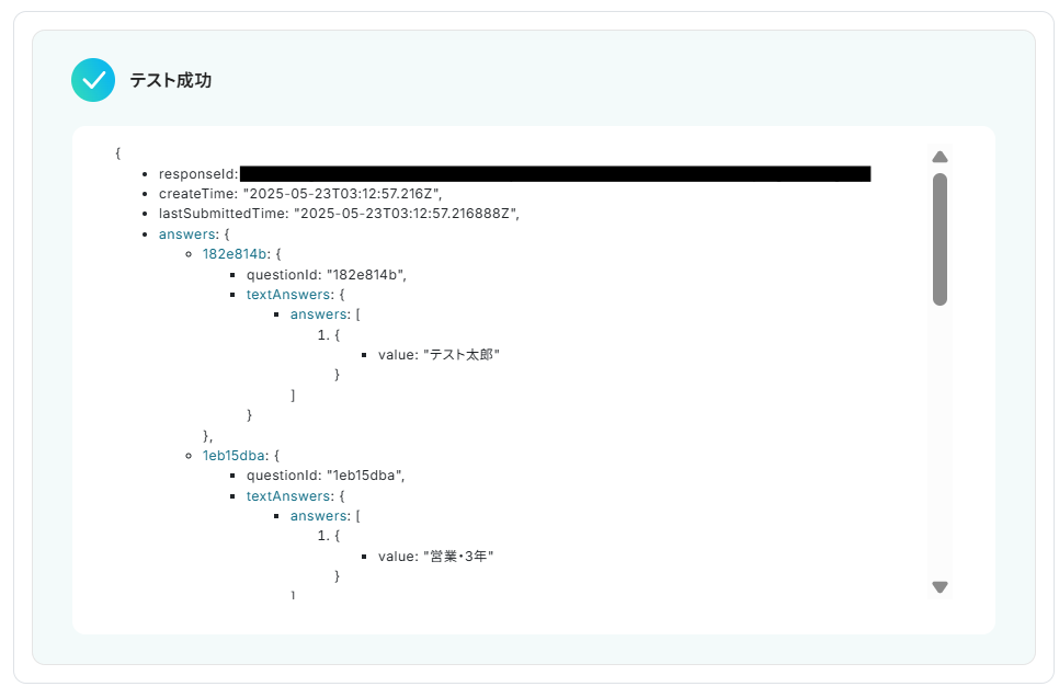 テストを行う前に、対象のGoogle フォームで回答を行ってから、テストをしてくださいね!