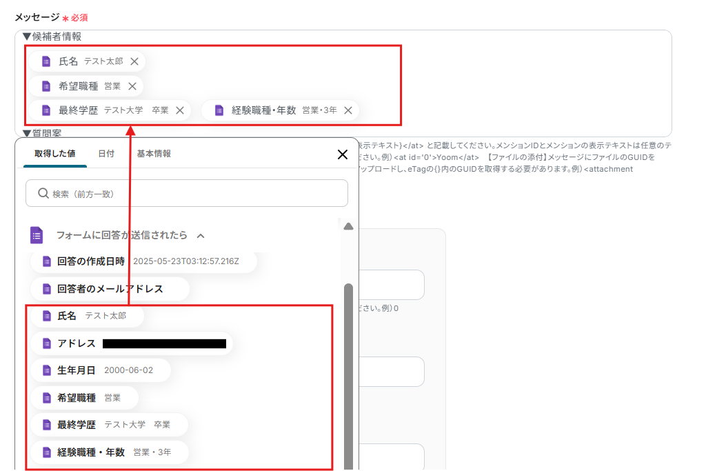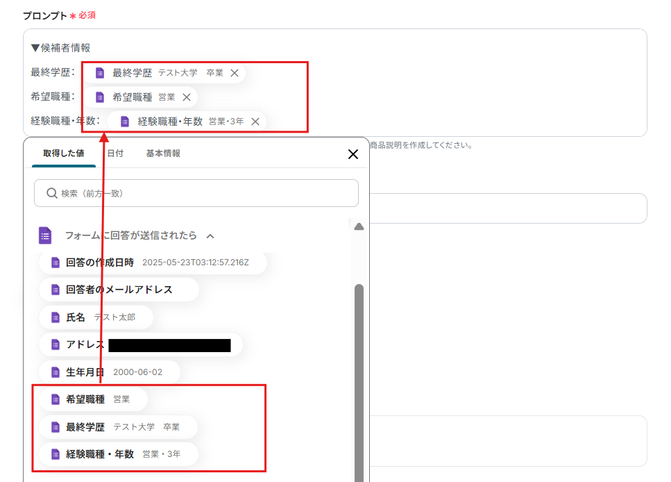候補者情報は、取得した値から、氏名、希望職種、最終学歴、経験職種・年数を入力しました。