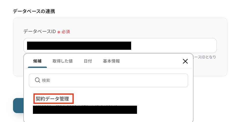 「データベースID」を、入力欄をクリックして表示される候補から選択しましょう。ここで設定したデータベースに、抽出したファイルデータを追加していきますよ!