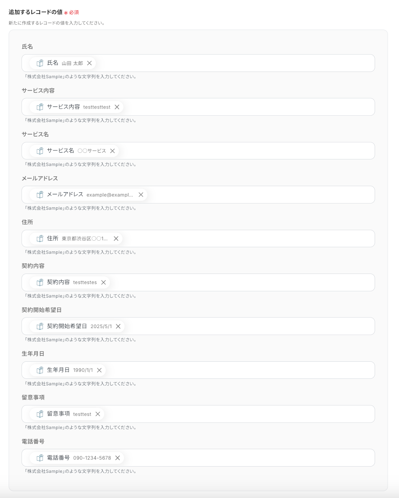 ※「追加するレコードの値」の項目は、連携しているデータベースに紐づいて表示されています。項目を編集したい場合は、データベースを編集してください。