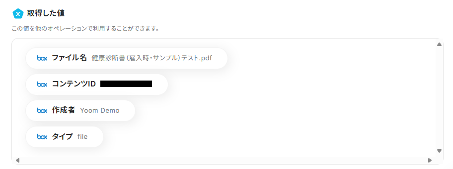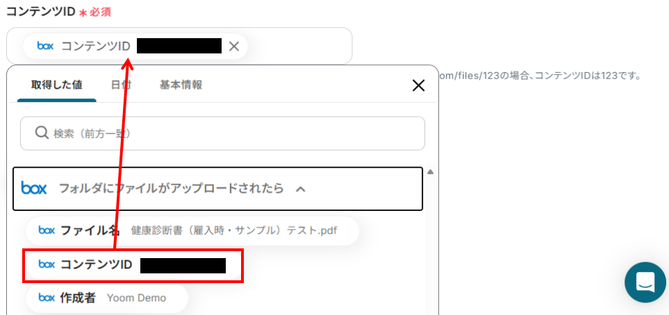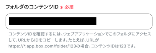 コンテンツIDの入力欄をクリックすると、下記のようなアウトプットが表示されます。BoxのコンテンツIDを選択してください。