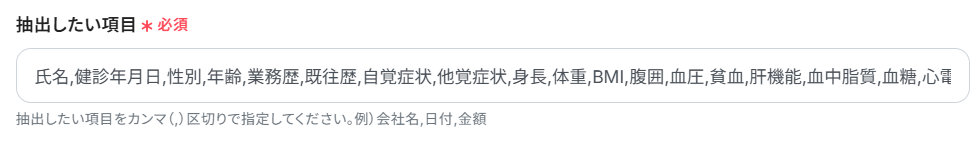 - 抽出したい項目:対象のファイルから抽出したい項目を入力しましょう。複数ある場合はカンマ区切りで指定してください。今回は、下記のように抽出したい項目を設定しました。