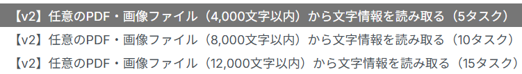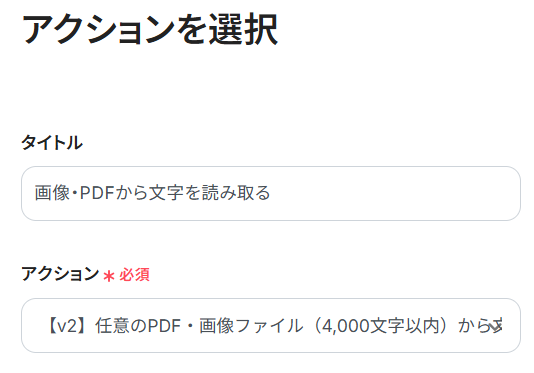 「アクション」は、デフォルトで「【v2】任意のPDF・画像ファイル(4,000文字以内)から文字情報を読み取る(5タスク)」が選択されています。()内に表記されている文字の数だけプロンプトが設定できます。変更する場合は、文字数と消費タスク量に注意して選択してください。
