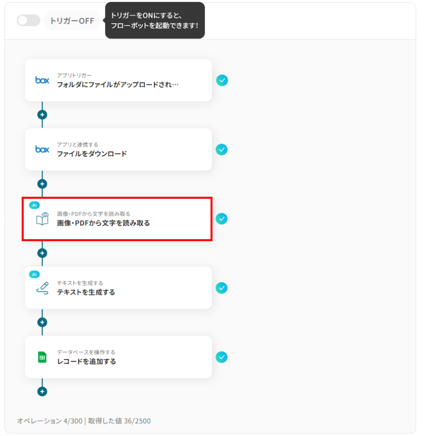 ・OCRのAIオペレーションはチームプラン・サクセスプランでのみご利用いただける機能となっております。フリープラン・ミニプランの場合は設定しているフローボットのオペレーションはエラーとなりますので、ご注意ください。