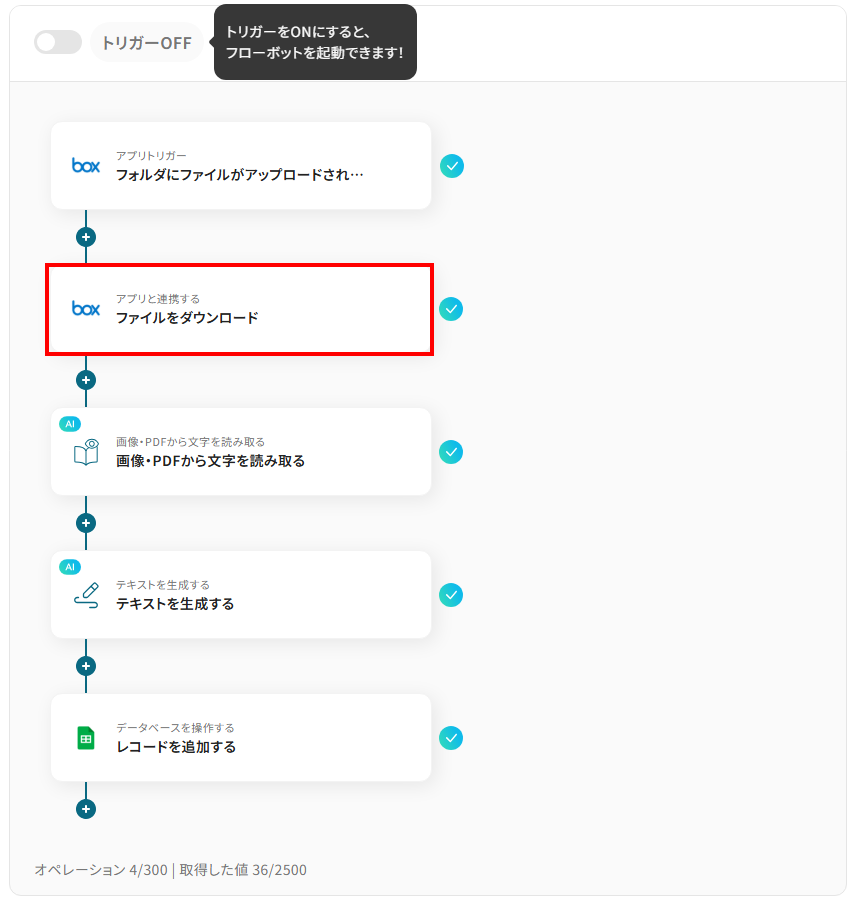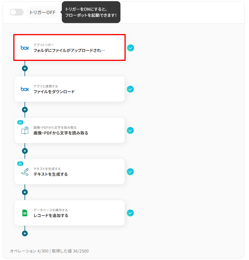 - Boxのトリガー設定とアクション設定、AIによる文字読み取り設定とテキスト生成設定、Google スプレッドシートのアクション設定