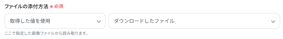 - ファイルの添付方法:デフォルトで先ほどダウンロードしたファイルが設定されています。特に変更せずにそのままでOKです。