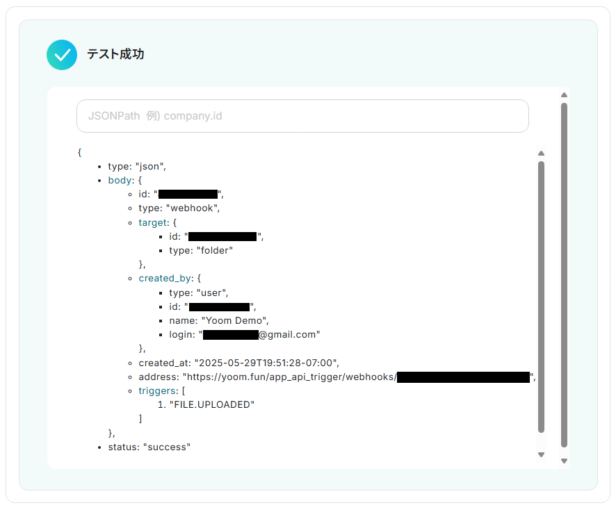 入力が完了したら、「テスト」を実行してみましょう。成功すると、下記のようなアウトプットが表示されるので、指定した項目が反映していればOKです!
