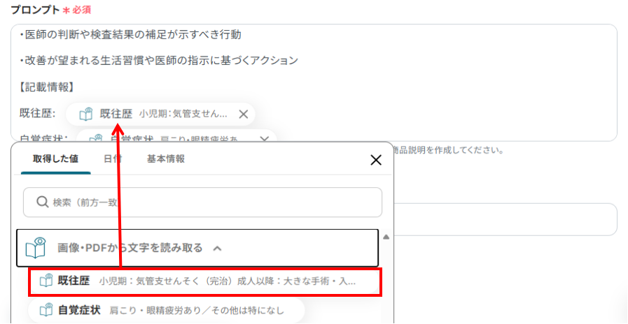 プロンプト欄をクリックすると、下記のようなアウトプットが表示されるので、先ほど生成したテキストを選択しましょう。