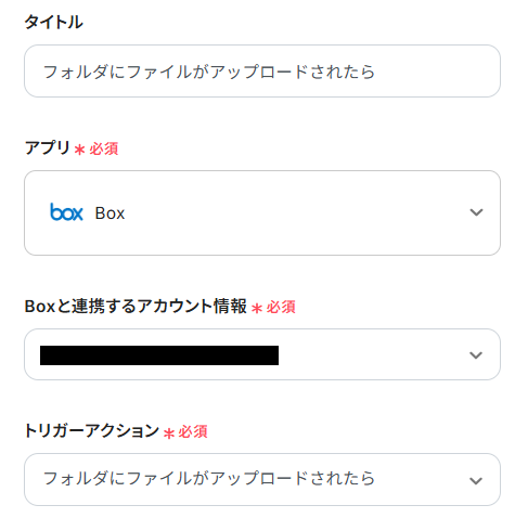 タイトルとアカウント情報はステップ1で設定した内容が入力されています。トリガーアクションは、テンプレート通りに「フォルダにファイルがアップロードされたら」のままで大丈夫です。