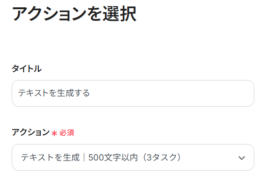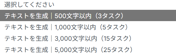 アクションは、デフォルトで「テキストを生成|500文字以内(3タスク)」が選択されています。こちらは変更可能なので、文字数と消費タスク量に注意して選択してください。