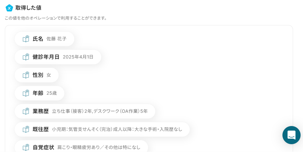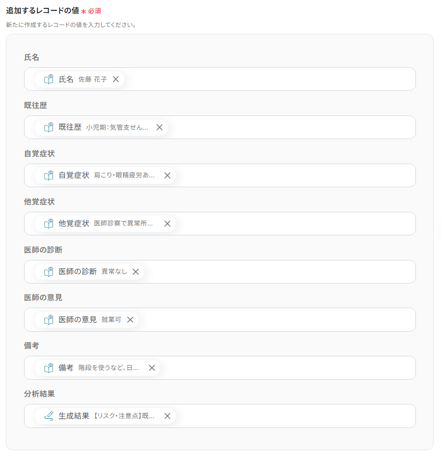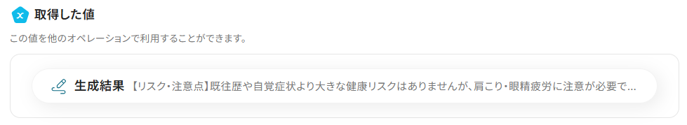 フォームで従業員から直接提出された健康診断データをAIが自動で内容を分析し、Notionのようなデータベースツールに自動で記録することもできます。データ収集から記録までのプロセスを自動化し、健康管理業務の負担軽減が可能です。