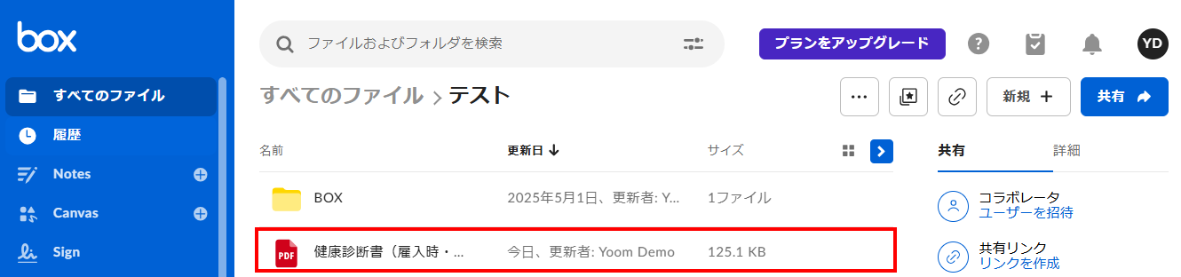 ダウンロードボタンが表示されますので、先ほどBoxにアップロードした資料かどうか確認してください。