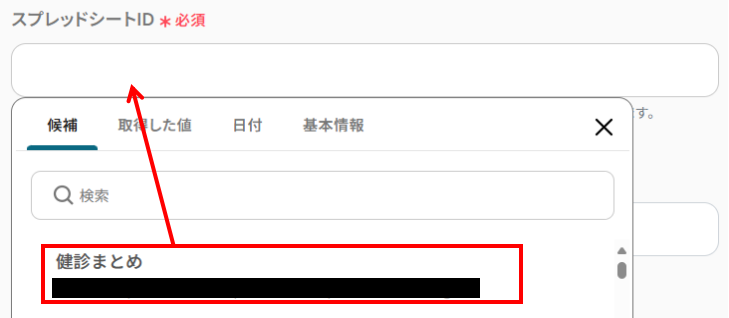 - スプレッドシートID:入力欄をクリックすると候補一覧が表示されますので、先ほど作成したGoogle スプレッドシートを選んでください。
