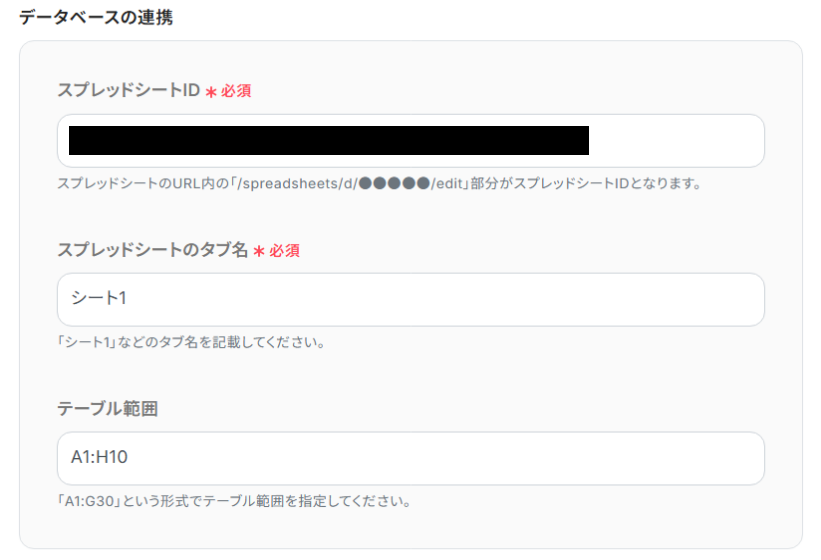 - スプレッドシートのタブ名:スプレッドシートIDと同じように、入力欄をクリックすると選択肢が出るので、該当するシートを選択しましょう。