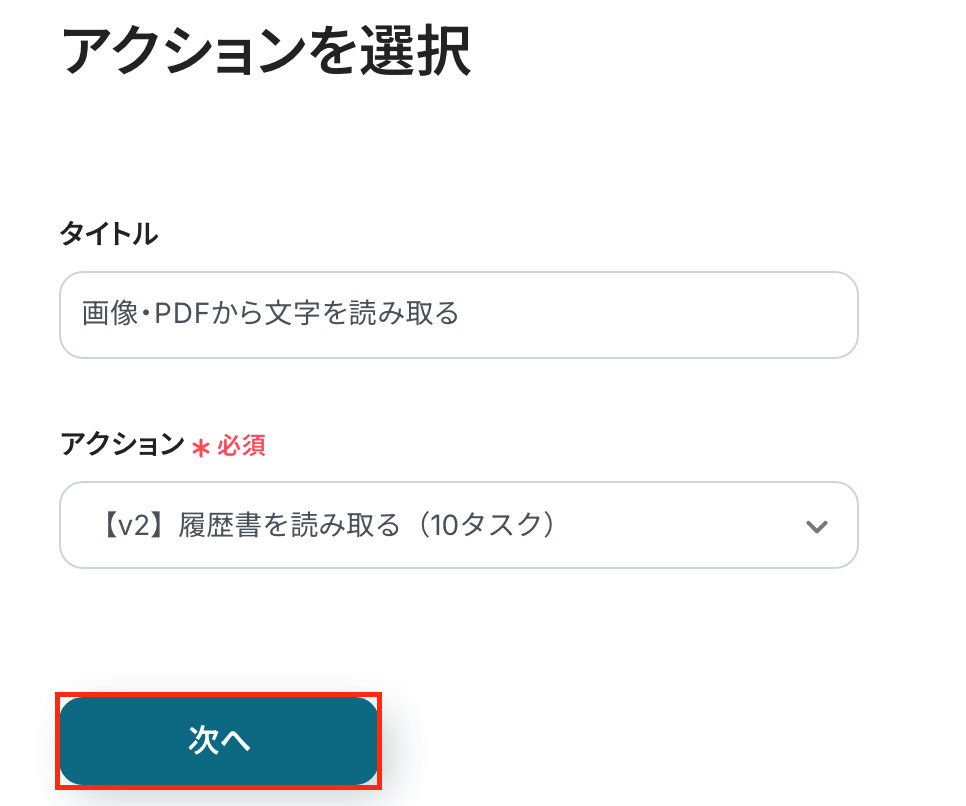「アクション」→【v2】履歴書を読み取る(10タスク) ※YoomのOCR機能では、アクション記載の規定の文字数を超えるデータや、文字が小さすぎる場合に正しく読み取れないことがあります。文字数や文字の大きさには少し余裕を持たせてご利用ください。