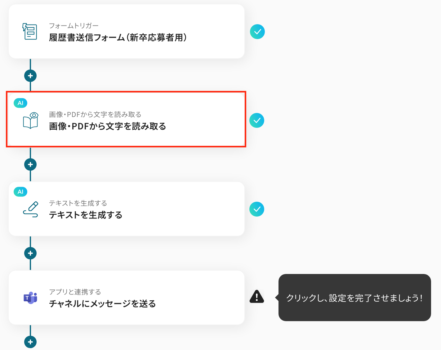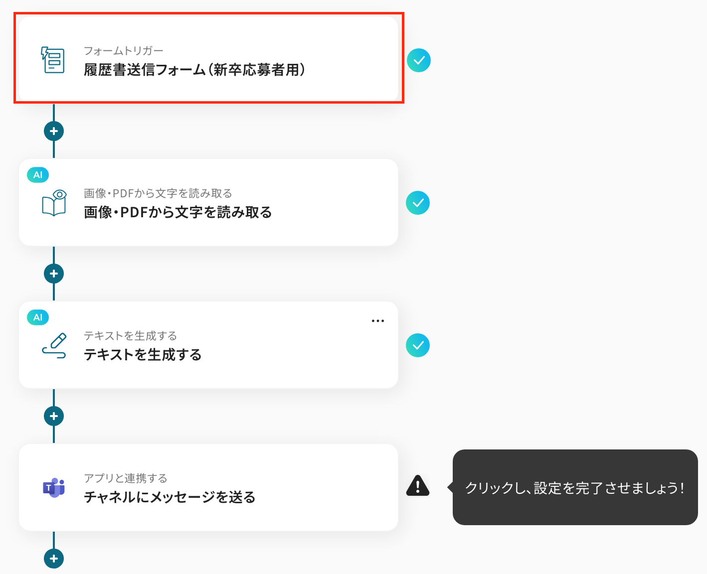 フォームトリガーも設定、OCRの設定、テキスト生成の設定、Microsoft Teamsアクションの設定