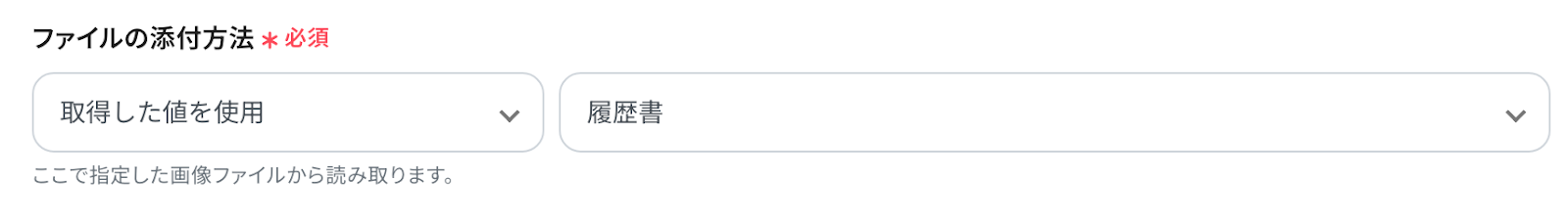 「ファイルの添付方法」 は、プルダウンから選択してください。今回は、前ステップで設定したサンプル値を使用するので「取得した値を使用」から「履歴書」を選択しました。
