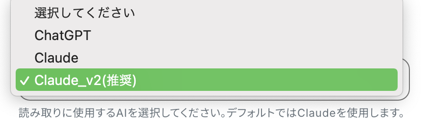 使用するAIを任意で選択しましょう。プルダウンから選択できます。 今回はClaude_v2(推奨)を選択しました。