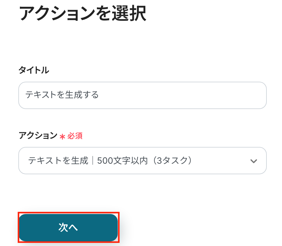 ここでは、先ほど読み取った情報からテキストを生成する設定を行います。 以下の赤枠をクリックしましょう!