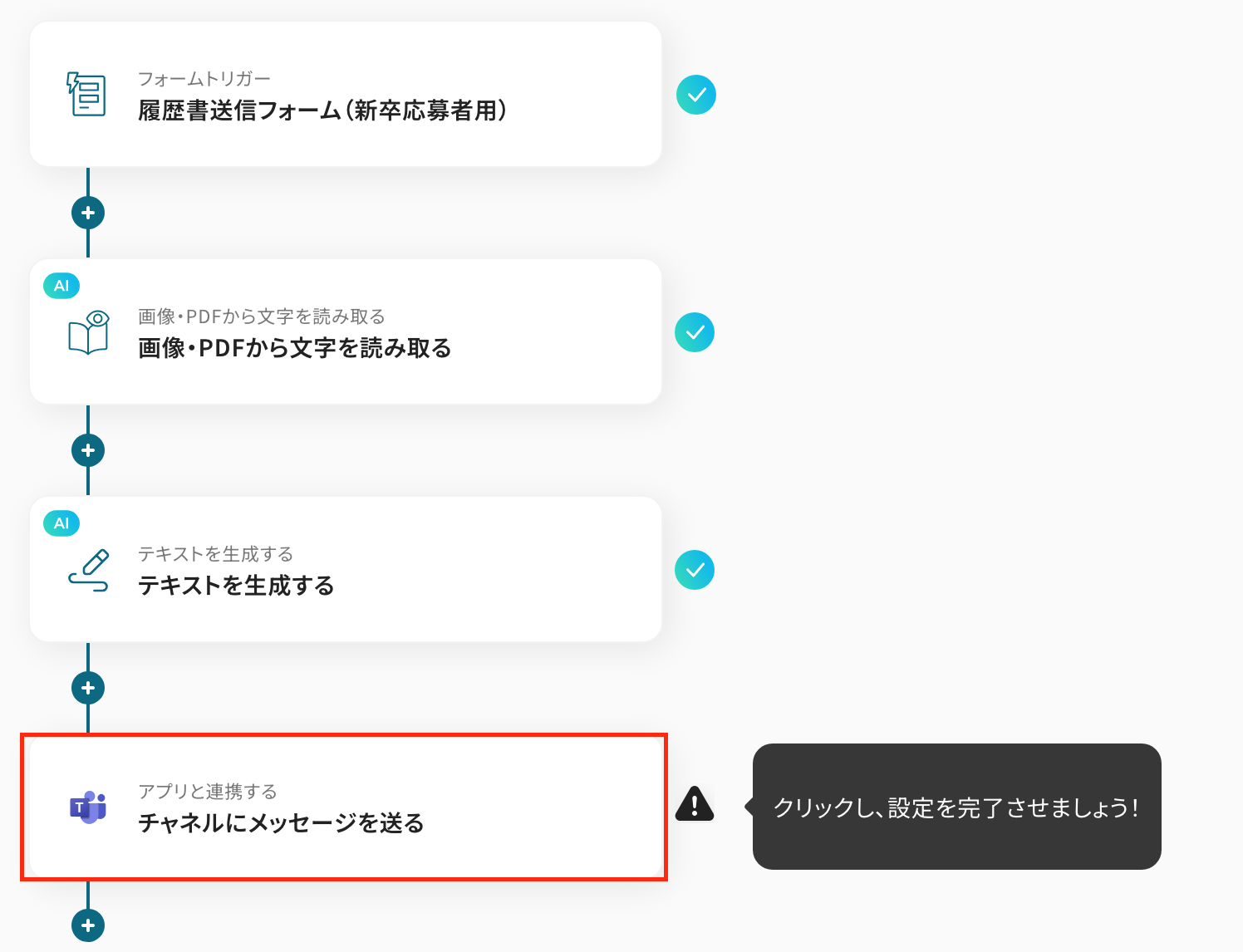 ■概要 「フォームで新卒採用応募者の履歴書が送信されたらOCRで読み取り、AIで面接質問を作成してMicrosoft Teamsに通知する」は、フォームで新卒採用応募者の履歴書が送信されたら、 OCRで情報を読み取り、AIが面接質問を自動生成しMicrosoft Teamsへ通知する業務ワークフローです。これにより、応募対応の手間を軽減します。 ■このテンプレートをおすすめする方 ・フォームとOCRを組み合わせた新卒採用AIワークフローを試したい人事担当者 ・履歴書の手作業入力や質問作成に時間を取られている採用業務のリーダー ・Microsoft Teamsで面接準備通知を一元管理したいチーム ・Yoomを活用してRPAやAIを組み合わせた自動化に興味があるIT部門の方 ■注意事項 ・Microsoft TeamsとYoomを連携してください。 ・OCRまたは音声を文字起こしするAIオペレーションはチームプラン・サクセスプランでのみご利用いただける機能となっております。フリープラン・ミニプランの場合は設定しているフローボットのオペレーションはエラーとなりますので、ご注意ください。 ・チームプランやサクセスプランなどの有料プランは、2週間の無料トライアルを行うことが可能です。無料トライアル中には制限対象のアプリやAI機能(オペレーション)を使用することができます。 ・Microsoft365(旧Office365)には、家庭向けプランと一般法人向けプラン(Microsoft365 Business)があり、一般法人向けプランに加入していない場合には認証に失敗する可能性があります。