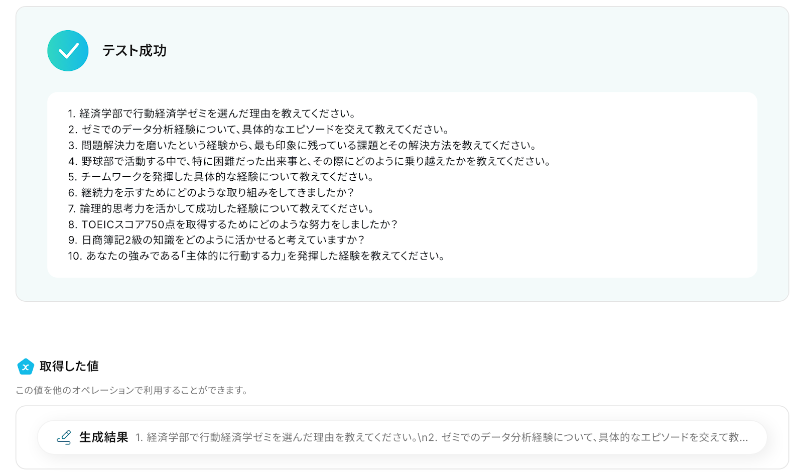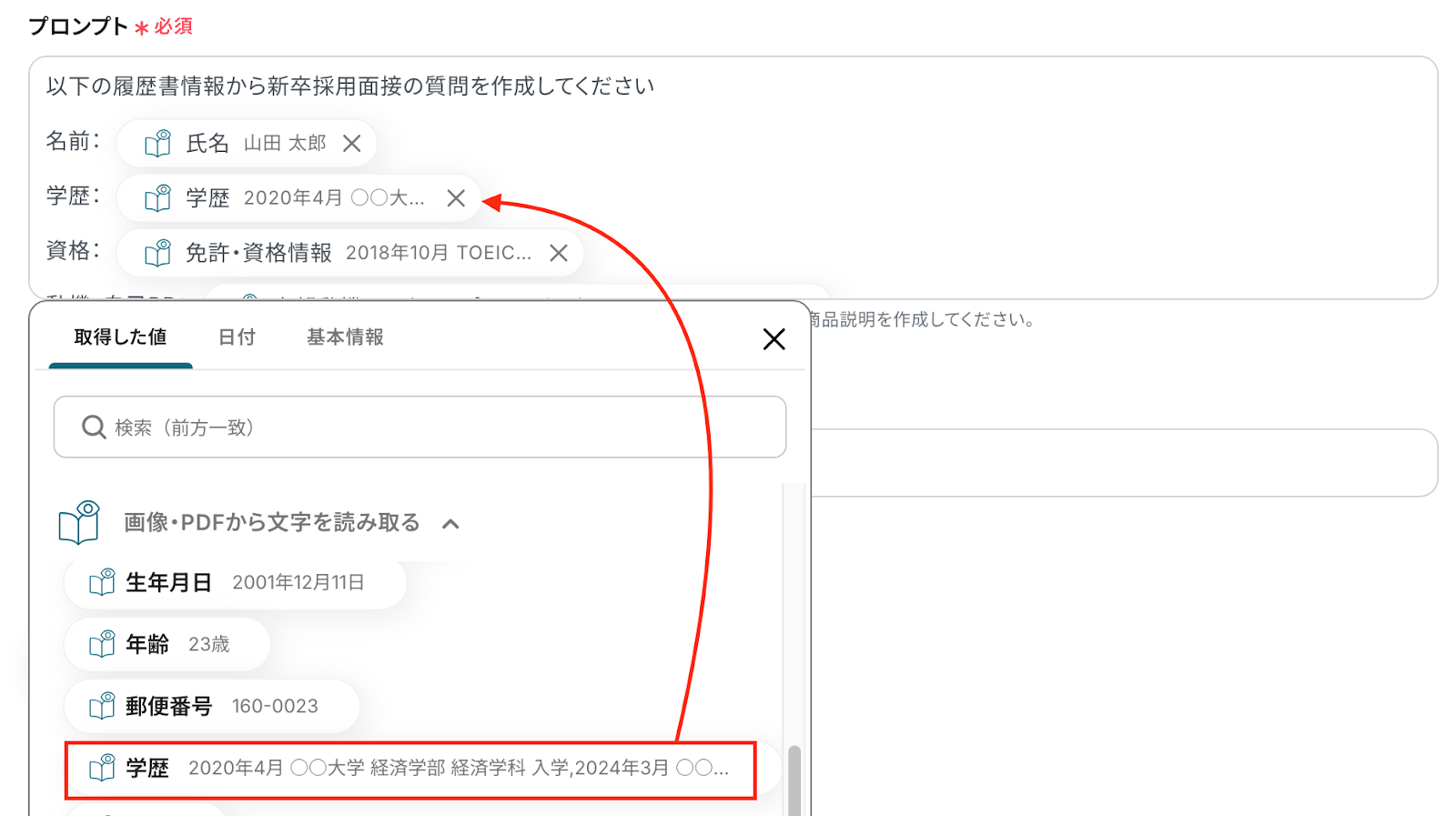 続いて、次の画面でプロンプトを設定していきます! 今回は、OCRで読み取った情報から新卒採用面接の質問を作成する設定なので、下図のように設定しました。 入力する際は、任意で作成した文章とアウトプットを組み合わせて設定してくださいね。