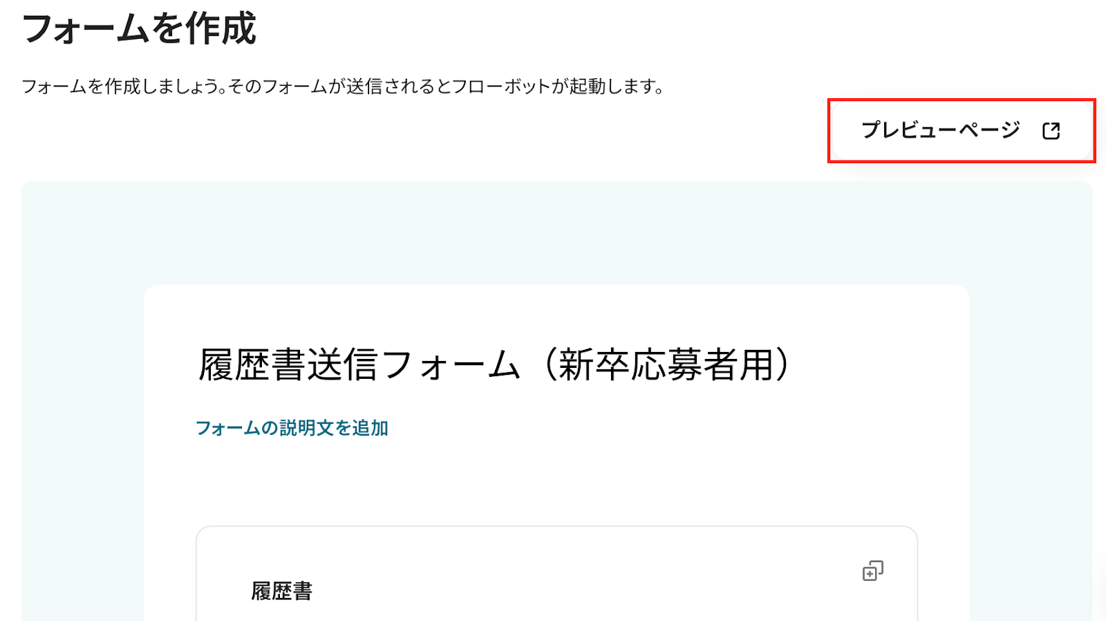 ここでは、履歴書を送信するための質問がすでに設定されていますが、フォームのタイトルや質問項目など、自由にカスタマイズも可能です。 プレビューページでは、フォームの完成形を確認できます!