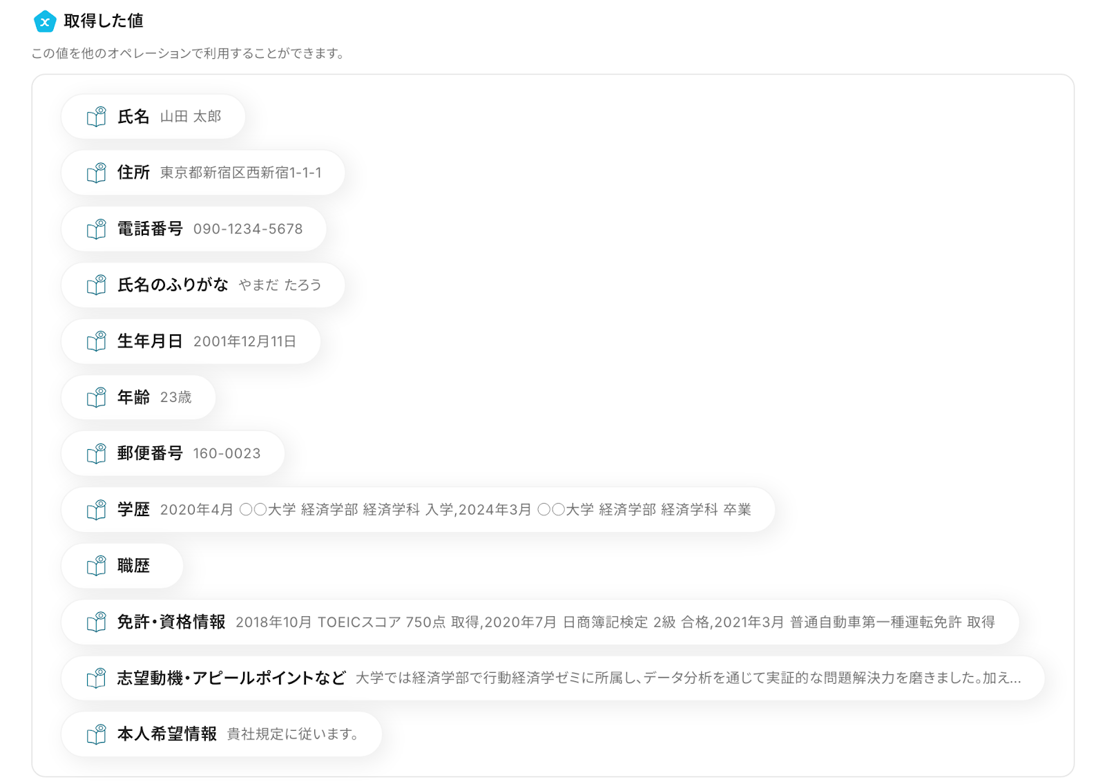 入力を終えたら、「テスト」を実行します。 すると、OCRで読み取った情報がアウトプット(取得した値) に表示されました!