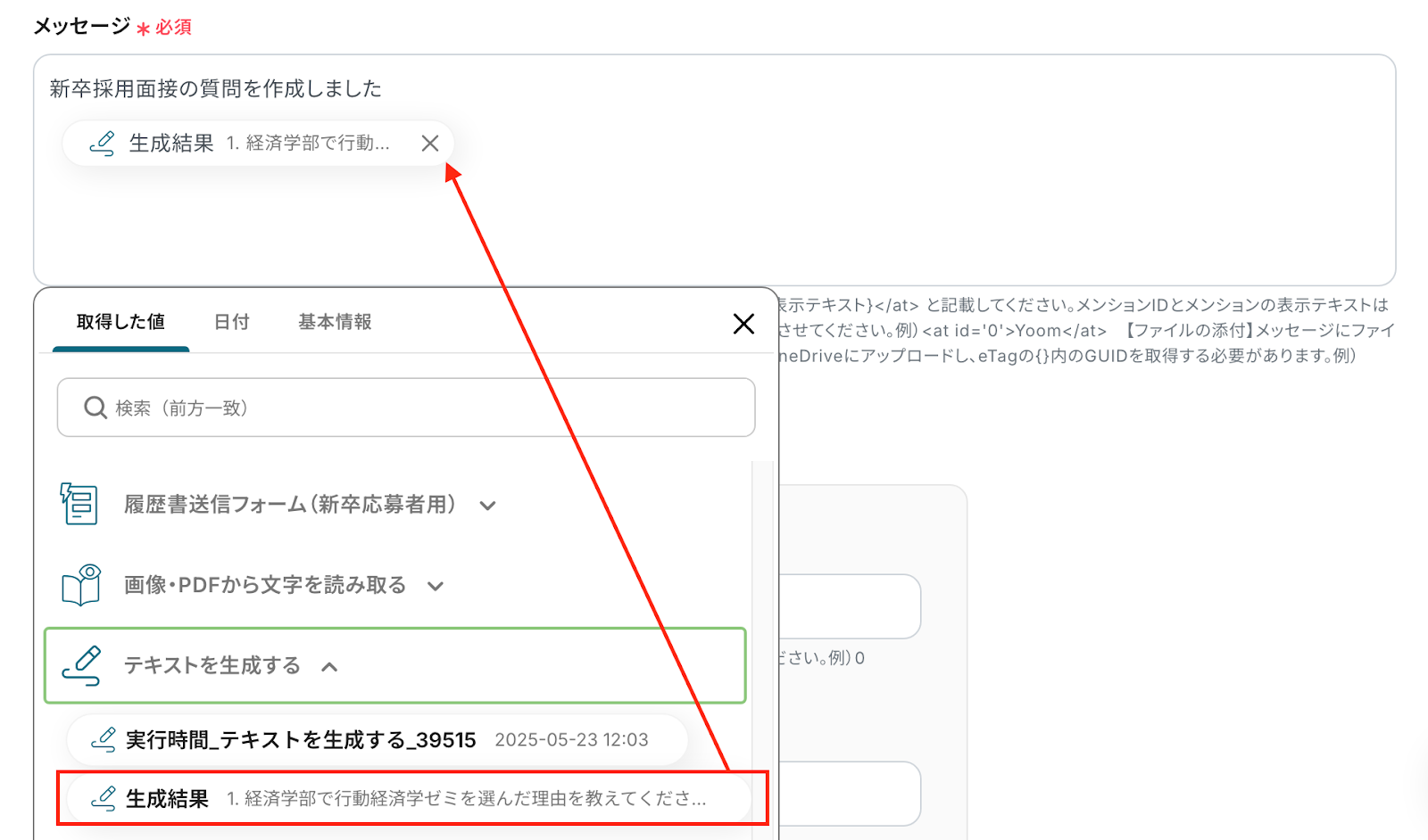 続いて、Microsoft Teamsに通知するメッセージを設定します。 以下の画像のように、入力欄をクリックして表示される「取得した値」と「任意の文章」を組み合わせて入力しましょう!自由にカスタマイズしてくださいね。 ※入力する際は、入力欄下の注釈を参照して入力してください。