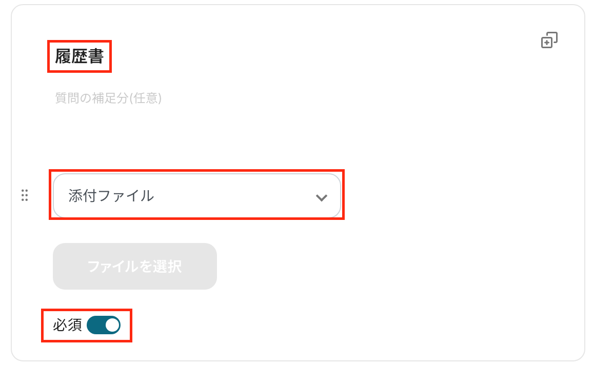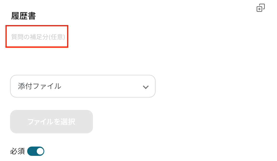 それでは、質問文、質問形式、必須項目にするかどうかを設定しましょう! 「履歴書」の部分が質問項目です。