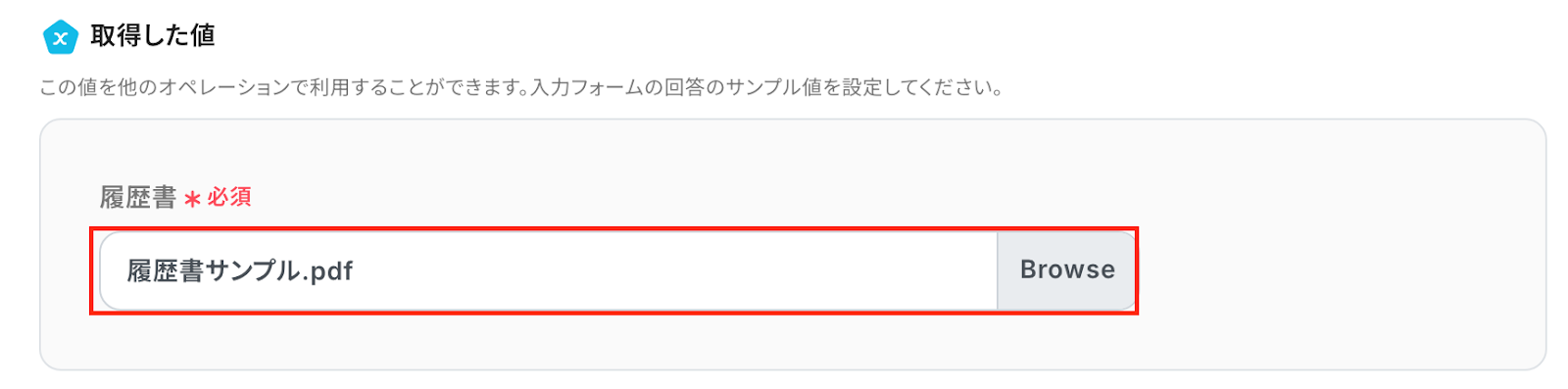 次に「取得した値」を、入力しましょう! ここでは、次ステップのOCR設定で使用するテスト用の履歴書を、Browseをクリックして選択します。 ※各項目名は、前ステップの質問文が表示されます。