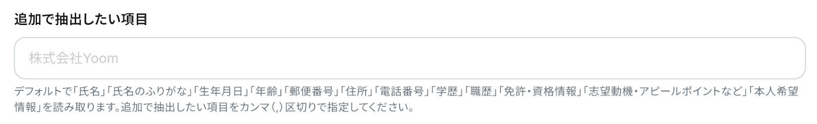 「抽出したい項目」 は、デフォルトで読み取れる情報以外に抽出したい項目を追加で設定できます。入力する際は、入力欄下の注釈に沿って入力しましょう。 今回は、空欄にしました。