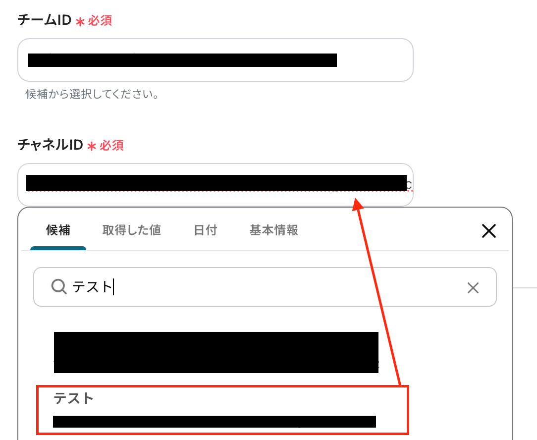 次に、API接続設定の画面で「チームID」と「チャンネルID」を入力しましょう。 以下の画像のように欄をクリックして表示される候補から該当するものをクリックしましょう。