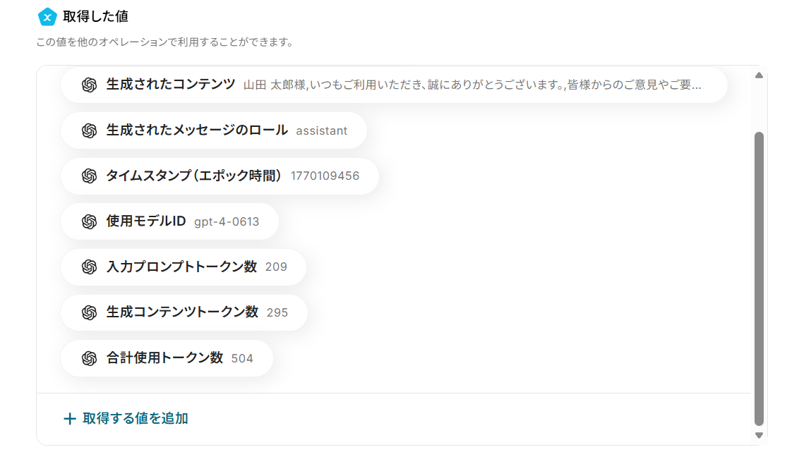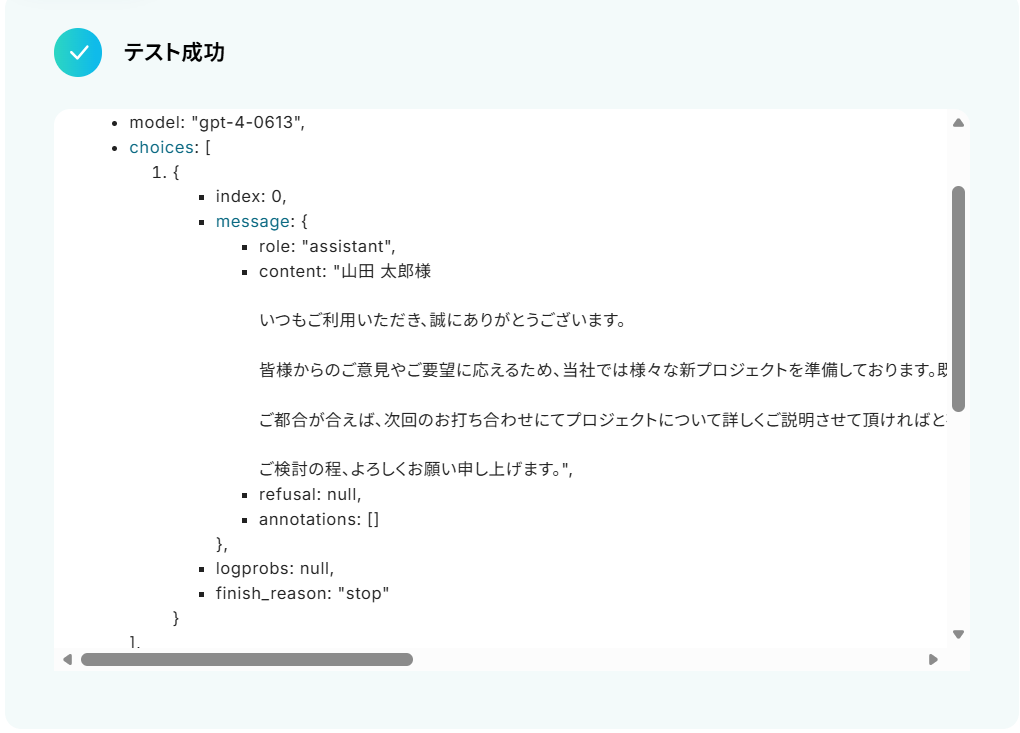 テストに成功すると、取得した値にOpenAIで生成された内容が追加されました!