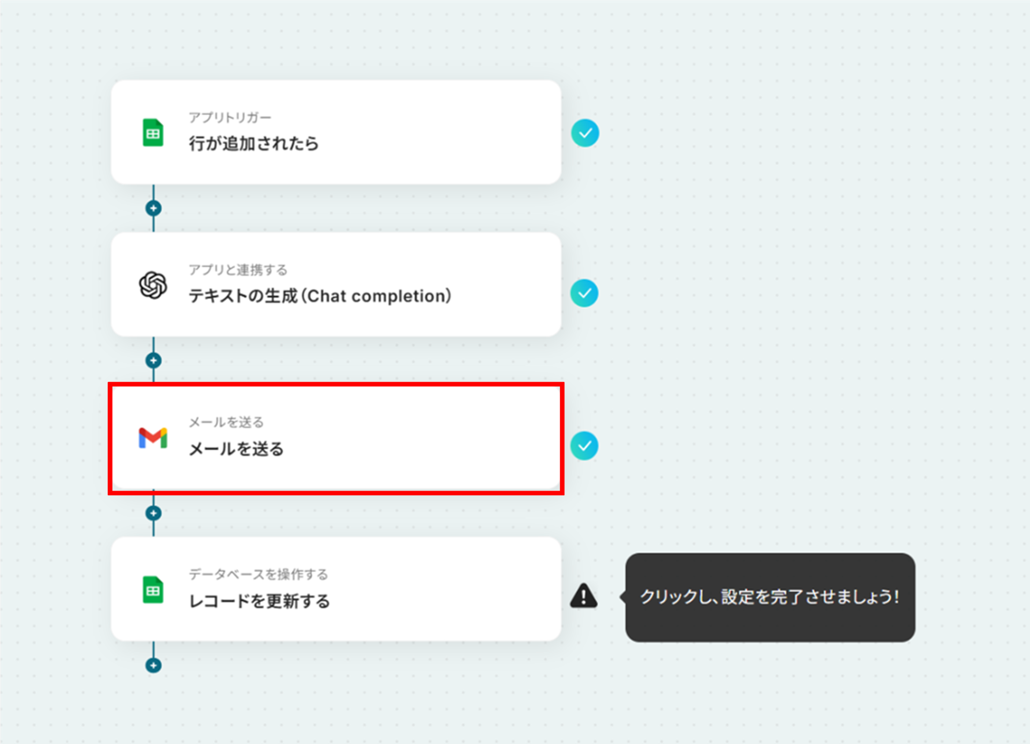 - 次に、オペレーションでGmailの「メールを送る」アクションを設定し、生成された文章を担当者や指定の宛先に通知します