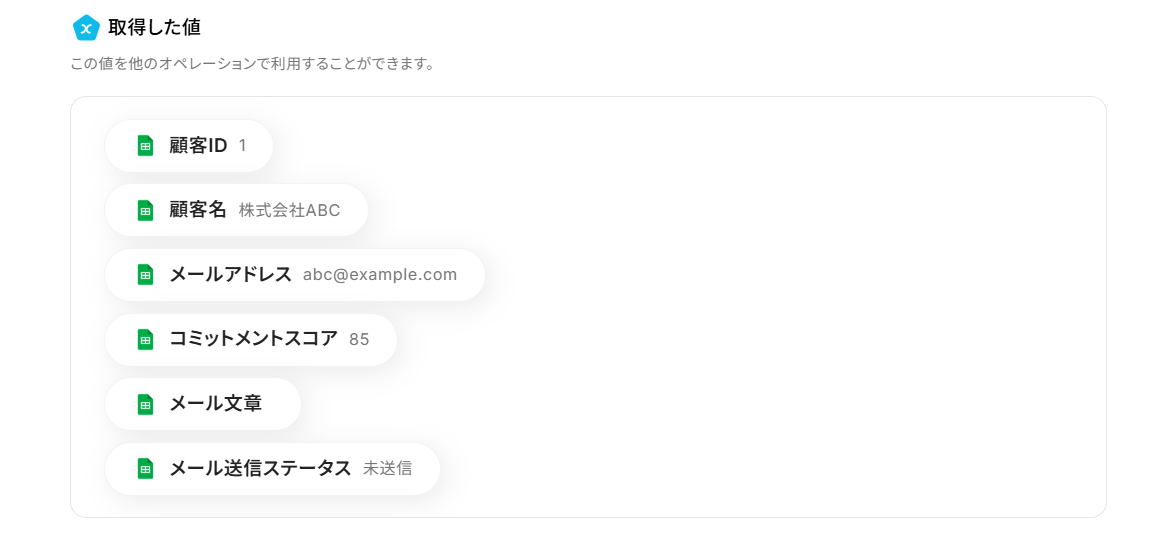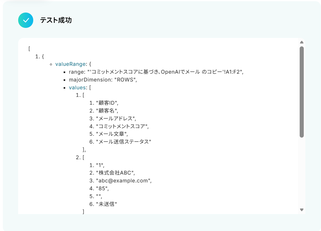 テストに成功すると、取得した値にGoogle スプレッドシートの情報が反映されます。
