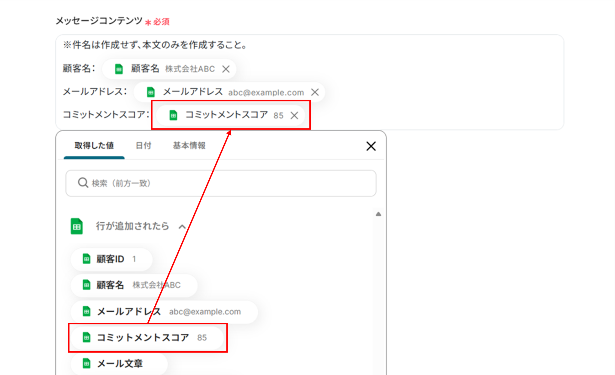 - 件名:直接入力します。件名に「取得した値」を使うことも可能です。