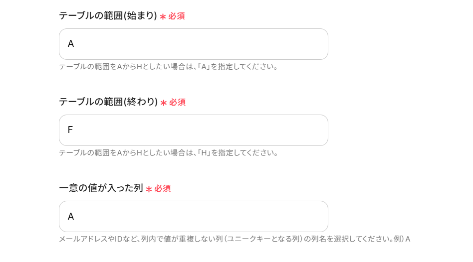 対象のGoogle スプレッドシートに合わせてテーブルの範囲を直接入力します。