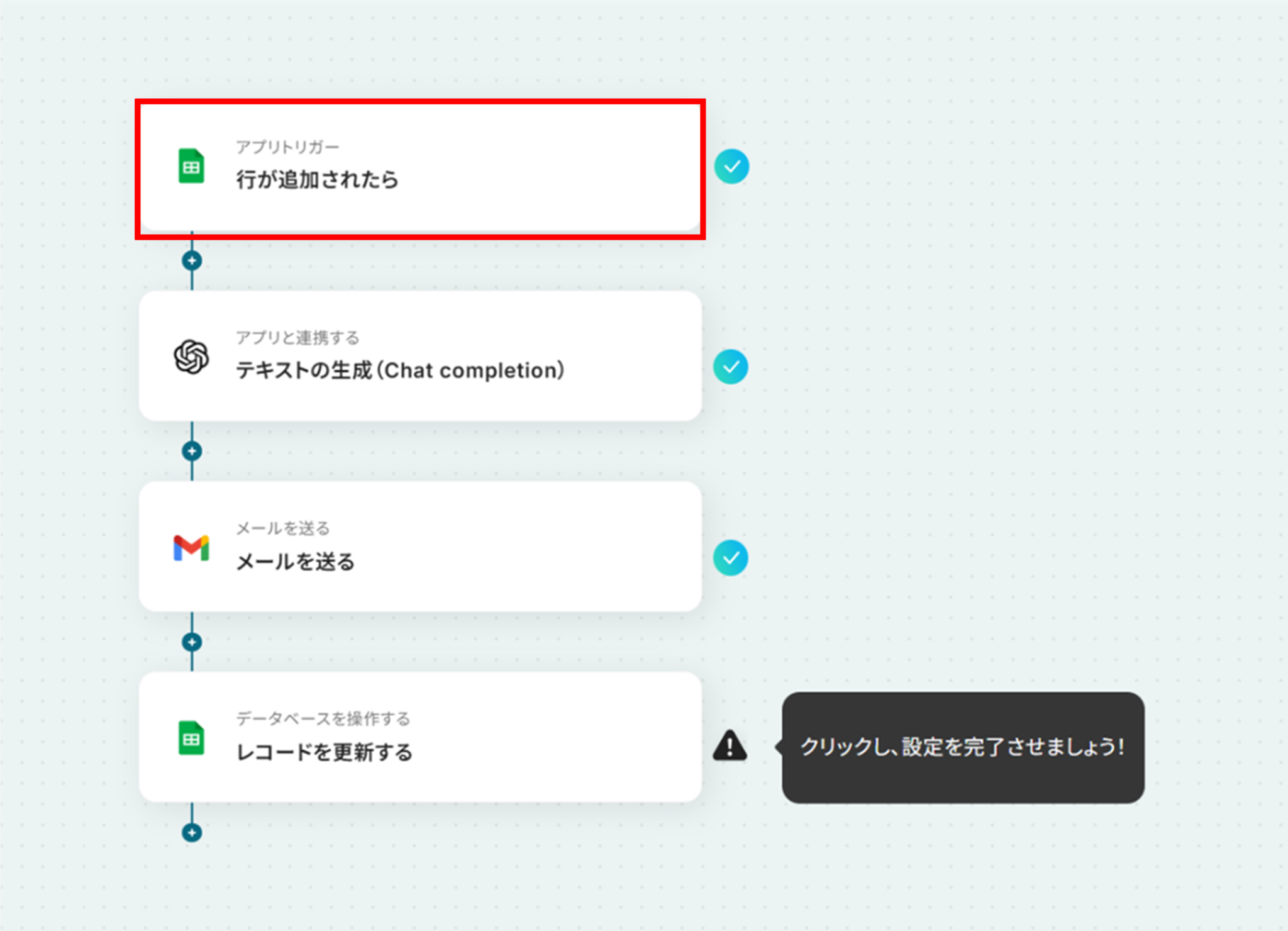 (1)それでは、Google スプレッドシートと連携して行が追加された際の設定を行います。