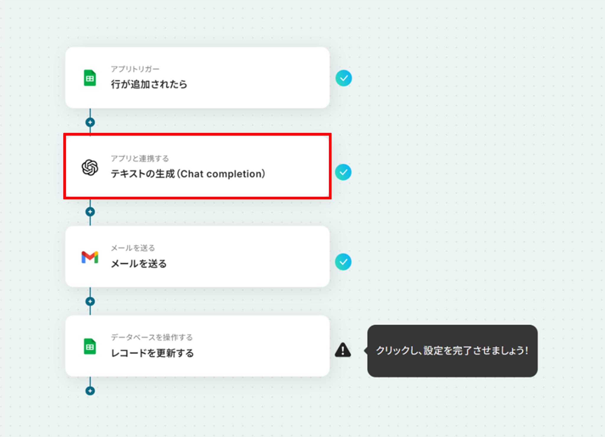 OpenAIの「テキスト生成」のアクションにて、スコアの段階に応じてアプローチを変更するように指示することで、メールの内容を変更することができます。
