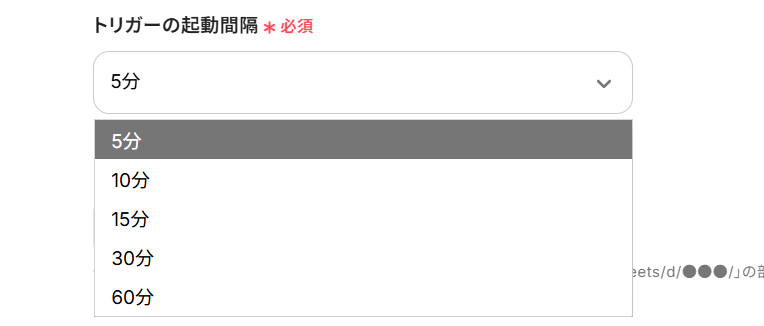 - トリガーは5分、10分、15分、30分、60分の間隔で起動間隔を選択できます。