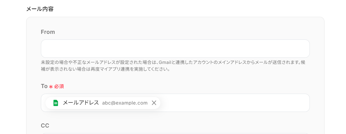下へ進み、「To」に取得した値を使って「メールアドレス」を設定します。