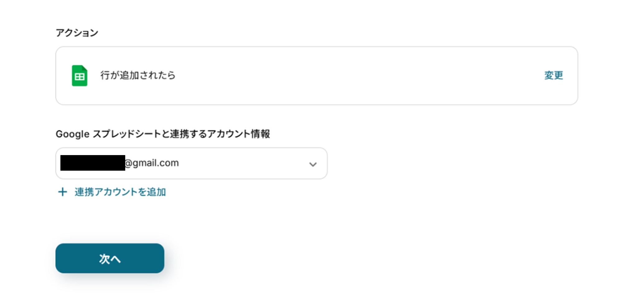 (2)「連携アカウントとアクションを選択」画面から、Google スプレッドシートと連携するアカウント情報に誤りがないかを確認し、アクションは「行が追加されたら」のままで「次へ」をクリックしましょう。