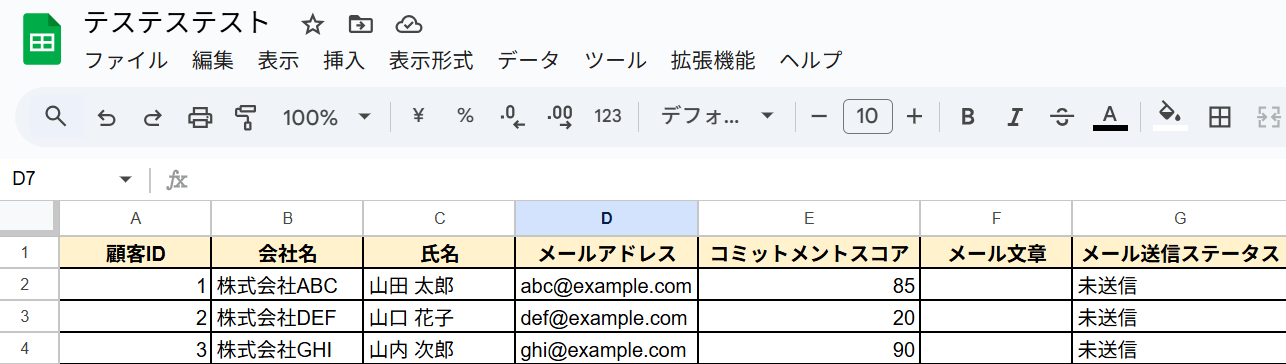 Yoomで設定をする前に、Google スプレッドシートにテスト用のシートを作成します。