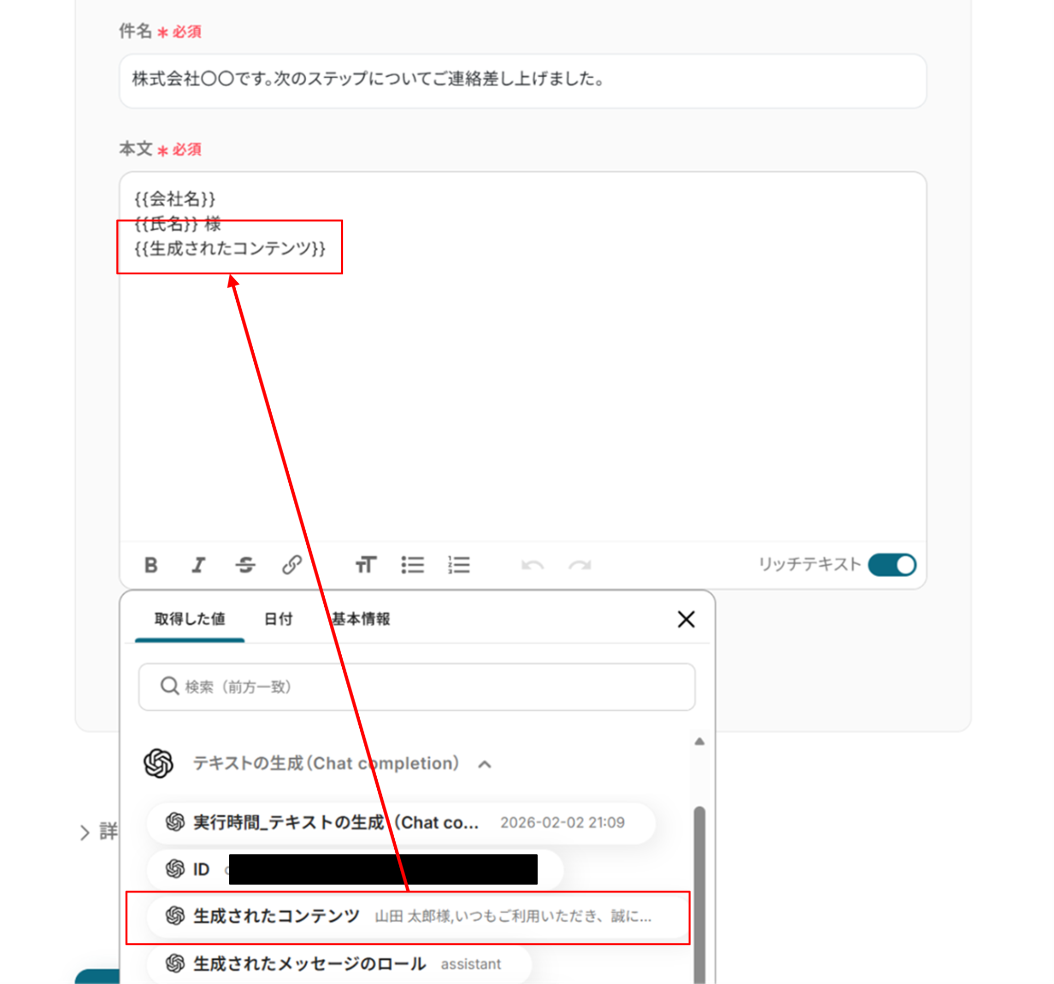 - 本文:固定文と一緒にOpenAIで取得した「生成されたコンテンツ」を使います。