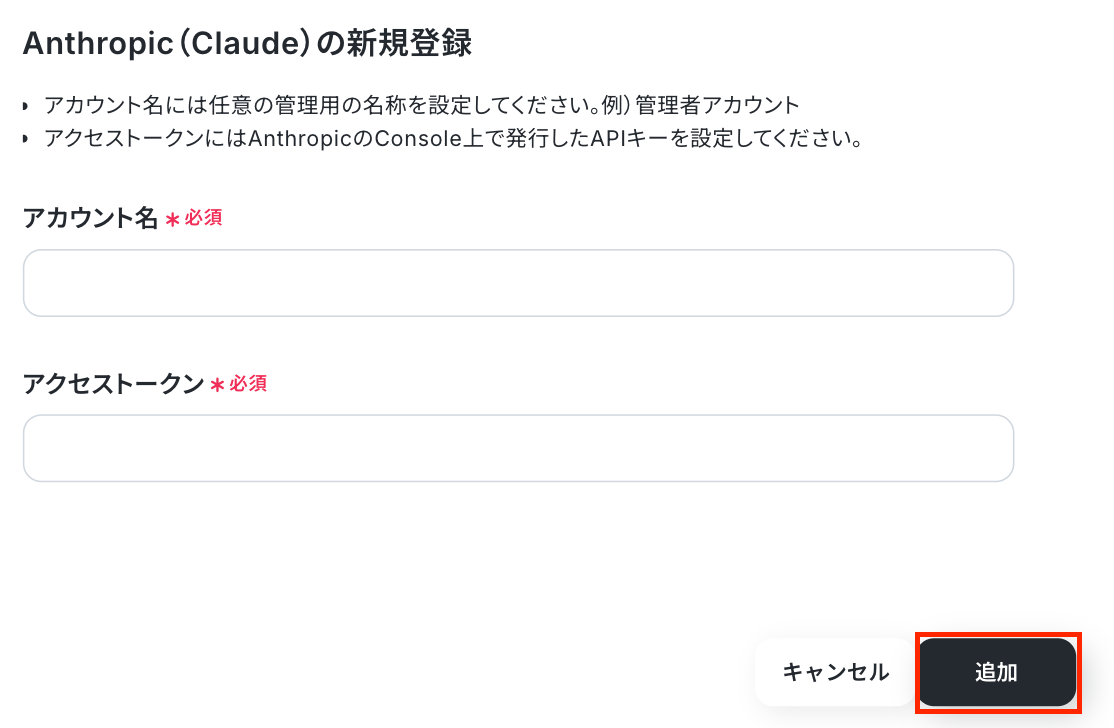 以下の画面が表示されるので、アカウント名とアクセストークンを注釈に沿って入力し、「追加」をクリックしましょう。 アクセストークン(APIキー)の取得方法は下記のサイトをご参照ください。