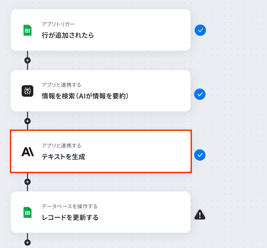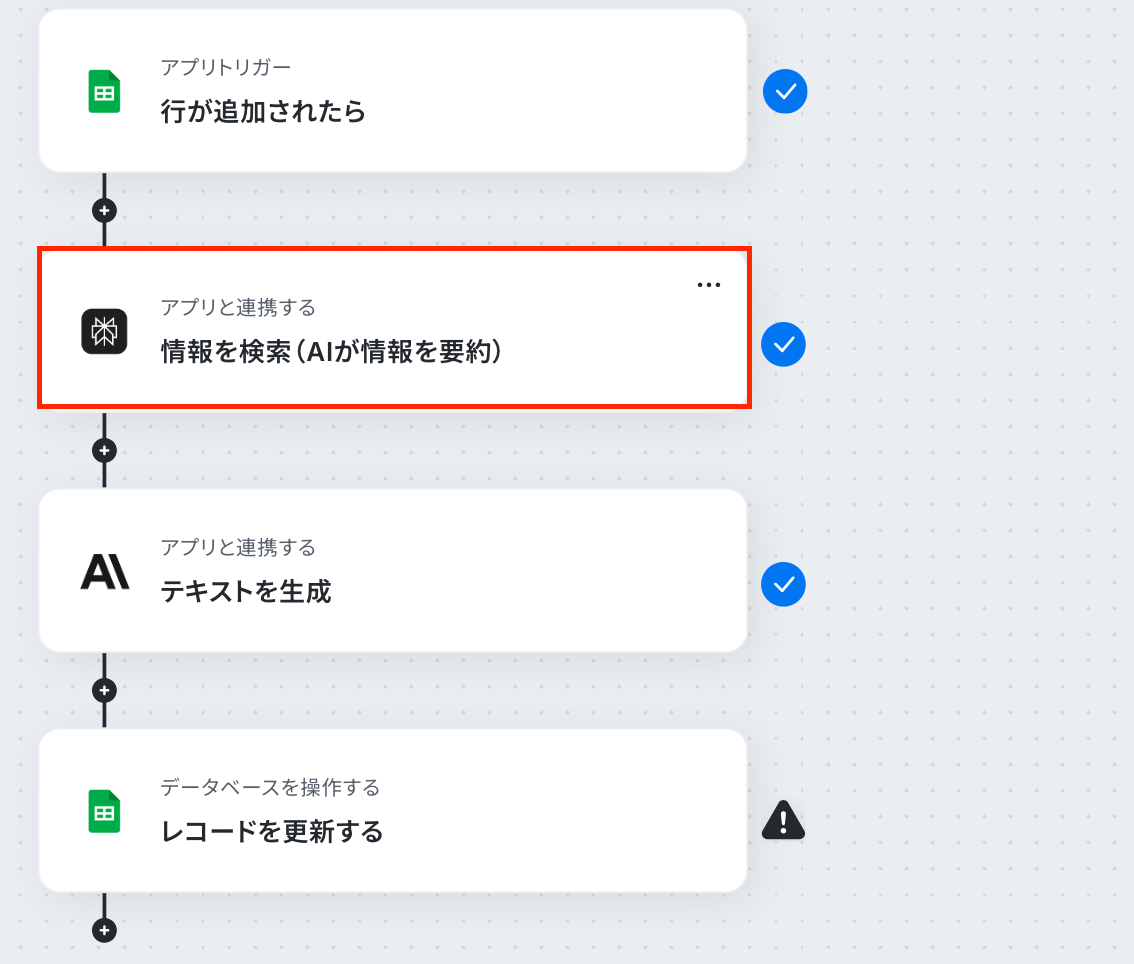 はじめに、Google スプレッドシート、Perplexity、Anthropic(Claude)をYoomと連携します。 次に、トリガーでGoogle スプレッドシートを選択し、「行が追加されたら」というアクションを設定します。 次に、オペレーションでPerplexityを選択し、追加された行の情報をもとに「情報を検索(AIが情報を要約)」アクションを設定します。 続いて、オペレーションでAnthropic(Claude)を選択し、Perplexityの要約結果などをもとに「テキストを生成」アクションを設定します。 最後に、オペレーションでGoogle スプレッドシートを選択し、「レコードを更新する」アクションでAIの生成結果を任意のセルに反映させます。 ※「トリガー」:フロー起動のきっかけとなるアクション、「オペレーション」:トリガー起動後、フロー内で処理を行うアクション ■このワークフローのカスタムポイント