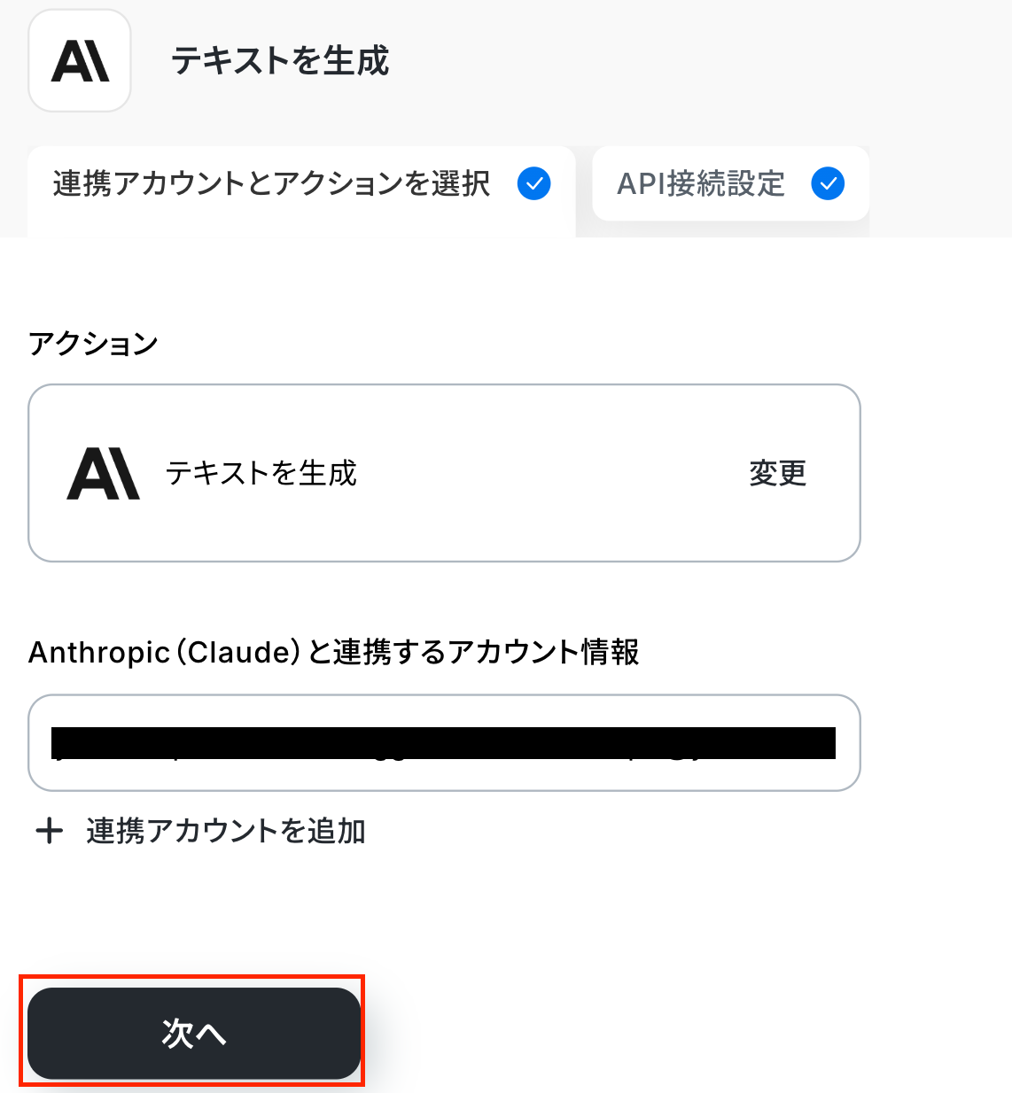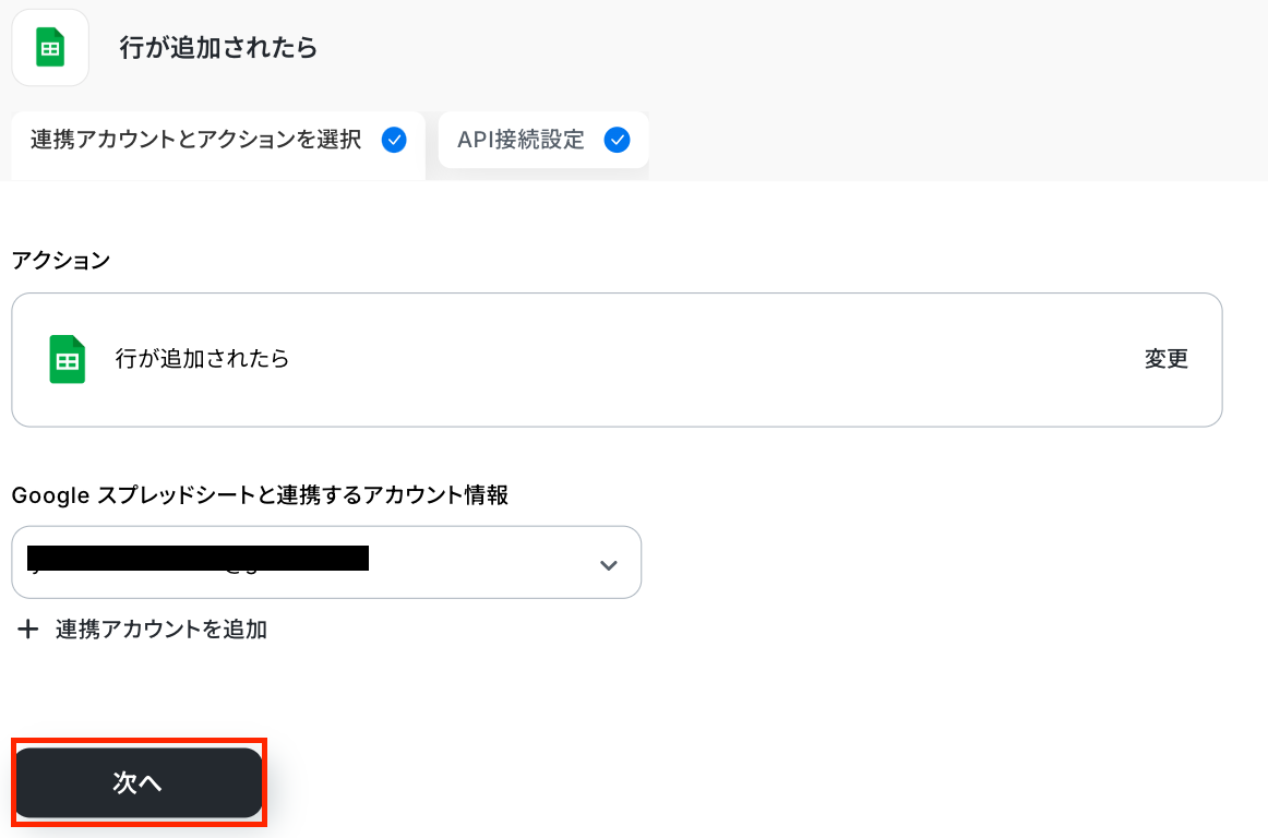 アクションはそのままで、連携するアカウント情報を確認しましょう。 問題がなければ、「次へ」をクリックします。